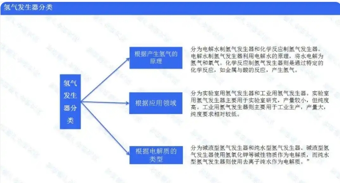 氫氣發(fā)生器根據(jù)產(chǎn)生氫氣的原理,可以分為電解水制氫氣發(fā)生器和化學(xué)反應(yīng)制氫氣發(fā)生器,前者利用電解水的原理將水電解為氫氣和氧氣,后者則通過(guò)特定的化學(xué)反應(yīng)如金屬與酸的反應(yīng)產(chǎn)生氫氣。根據(jù)應(yīng)用領(lǐng)域可以分為實(shí)驗(yàn)室用氫氣發(fā)生器和工業(yè)用氫氣發(fā)生器,前者主要用于實(shí)驗(yàn)室研究,產(chǎn)量較小但純度高,后者則主要用于工業(yè)生產(chǎn),產(chǎn)量大但純度要求相對(duì)較低。此外,根據(jù)電解質(zhì)的類型,電解水制氫氣發(fā)生器又可以分為堿液型氫氣發(fā)生器和純水型氫氣發(fā)生器,前者使用氫氧化鉀等堿性物質(zhì)作為電解質(zhì),后者則使用去離子純水作為電解質(zhì)。