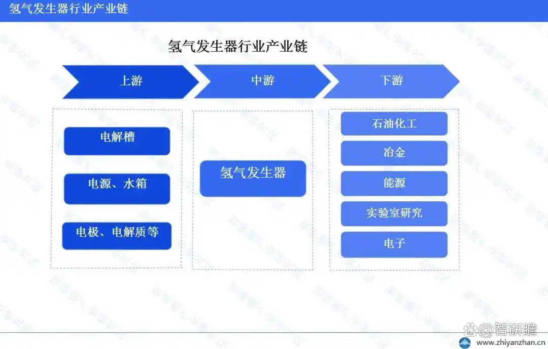 氫氣發(fā)生器上游主要包括電解槽、電源、水箱、電極、電解質(zhì)等。其中,電解槽是氫氣發(fā)生器的核心部件,用于電解水產(chǎn)生氫氣和氧氣。電源提供電解所需的電能,水箱則用于儲(chǔ)存水源。電極和電解質(zhì)則是電解過(guò)程中的關(guān)鍵材料,直接影響電解效率和產(chǎn)氫純度。氫氣發(fā)生器廣泛應(yīng)用于各個(gè)行業(yè),主要包括石油化工、冶金、能源、電子和實(shí)驗(yàn)室研究等。